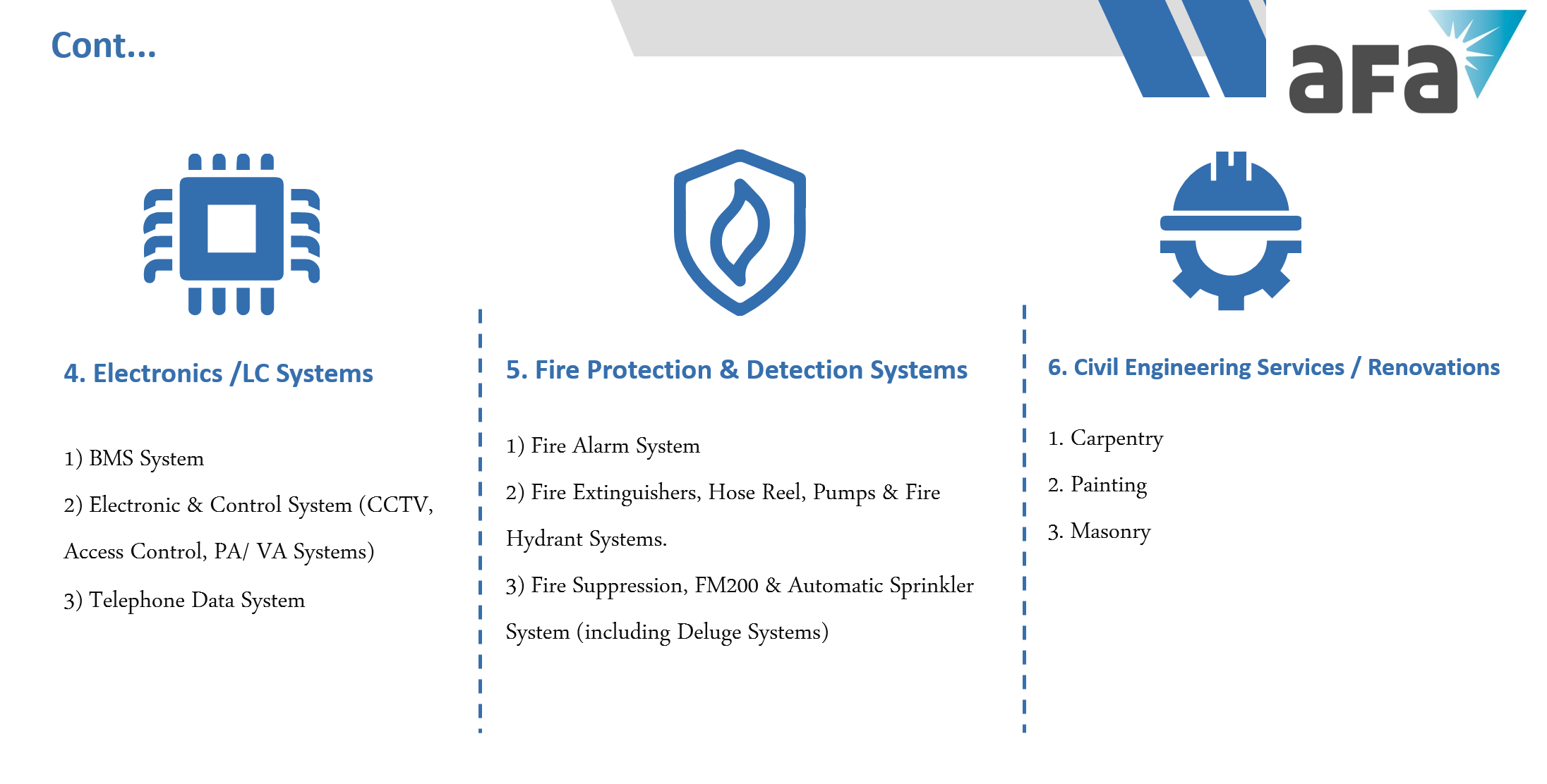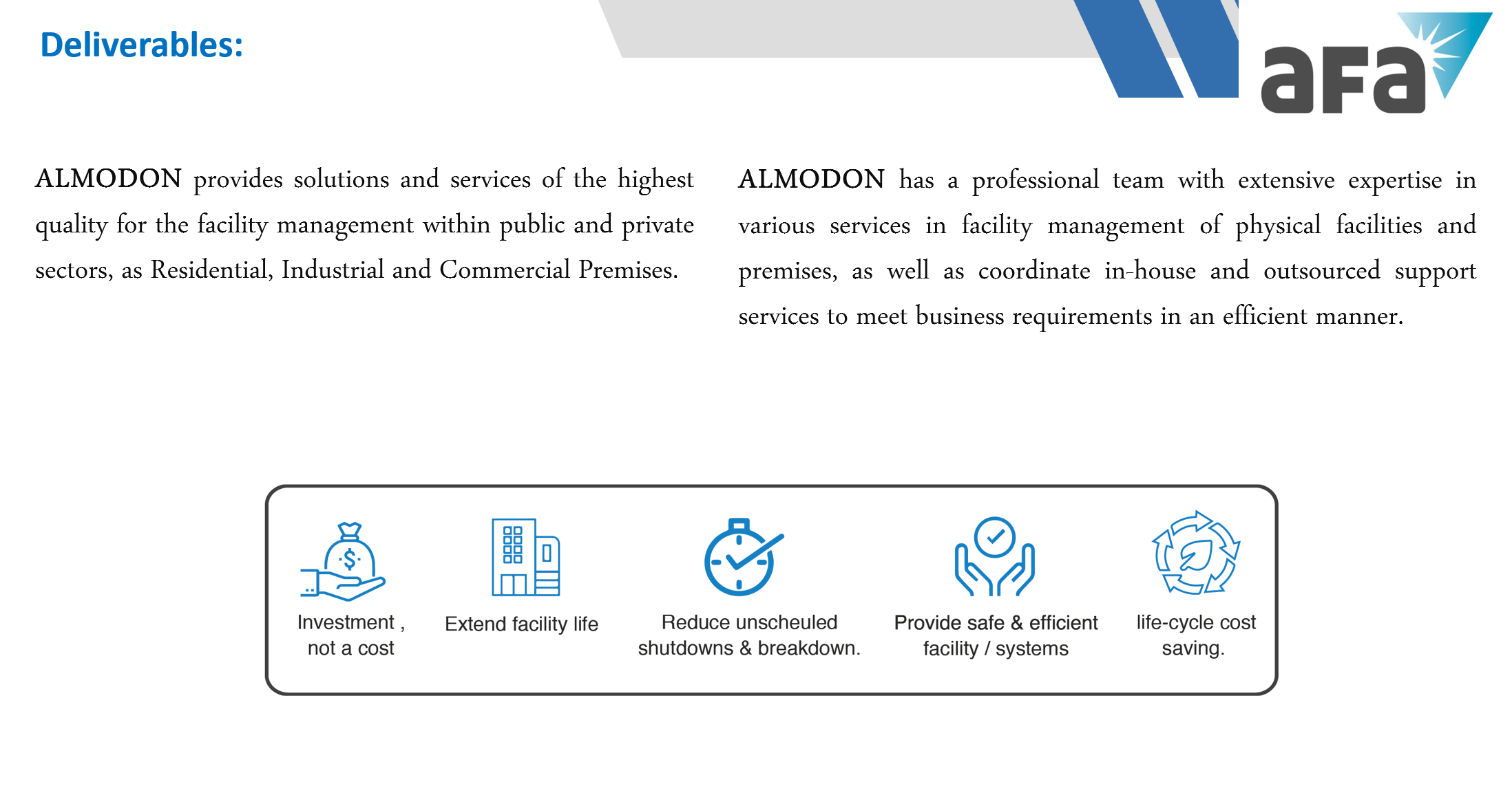 FM Overview | Framework Implementation | Functions | Deliverables FM Services | Hard | Soft | Specialized FM Process | PM | CM | CMMS | Asset Tagging Proposed Organization Chart for project Distribution of cleaners Equipment, Tools & Machinery